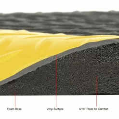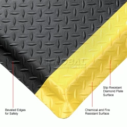 The absolute favorite for comfort. Diamond-patterned anti-fatigue matting offers comfortable underfoot cushioning. Reduces pressure pain caused by prolonged standing, this comfortable mat promotes employee productivity, morale and physical well being. For use in even the toughest dry work areas. The chemical resistant, durable deck-plate surface mat is bonded to a vinyl top with buoyant foam base. Beveled for safety.