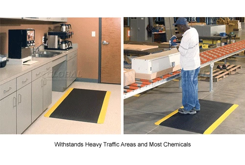 This top quality matting features a 3 Year Limited Warranty against wear. Measures 11/16″ thick, its durability and comfort come from premium 1/2″ thick closed-cell foam topped with a rubberized surface fights fatigue with super soft cushioning and superior resilience. Rubberized, pyramid textured surface withstands heavy traffic and most chemicals and provides exceptional wet or dry traction. Includes safety beveled edges.