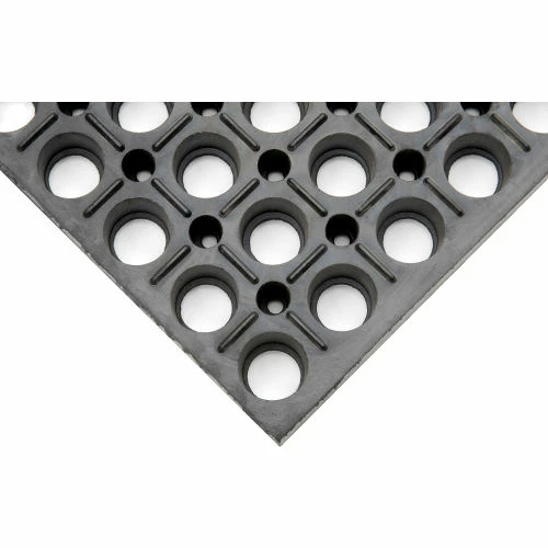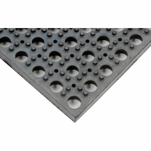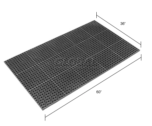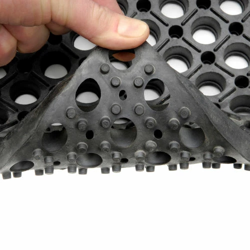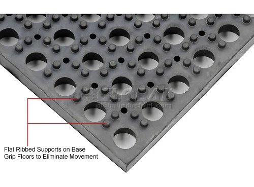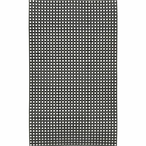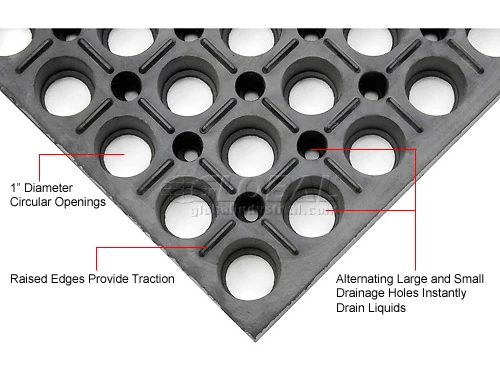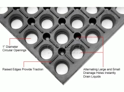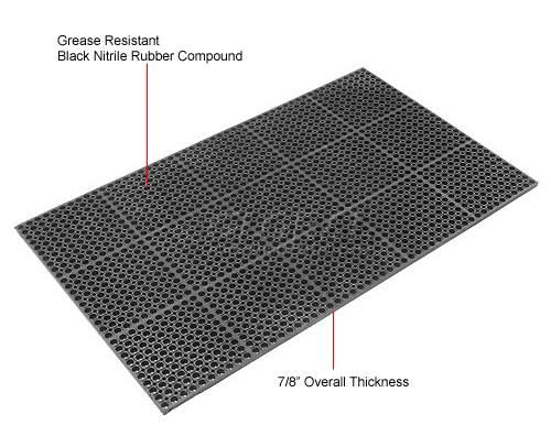 The tough nitrile rubber compound relieves leg and back discomfort and resists animal fats and grease. Alternating large and small drainage holes enhance works comfort and safety by instantly draining liquid from the top surfaces. Black Mat is grease resistant.