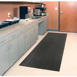 Corrugated ribbed surface helps prevent slips and falls and resists water and chemicals. Won’t curl, shrink or separate, protecting personnel and floors. Easy to clean 1/8″ thick black rubber.