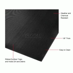 Corrugated ribbed surface helps prevent slips and falls and resists water and chemicals. Won’t curl, shrink or separate, protecting personnel and floors. Easy to clean 1/8″ thick black rubber.