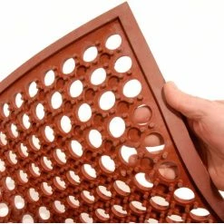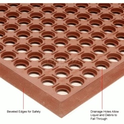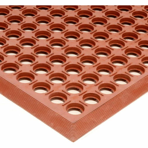 Ideal for food service environments, industrial applications or outdoor entrances. Features beveled edges to help provide a no-slip, no-trip work area. Allows solids and liquids to fall through the circular open rubber construction to leave a clean, dry, safe walking surface. Constructed from Nitrile rubber.