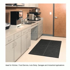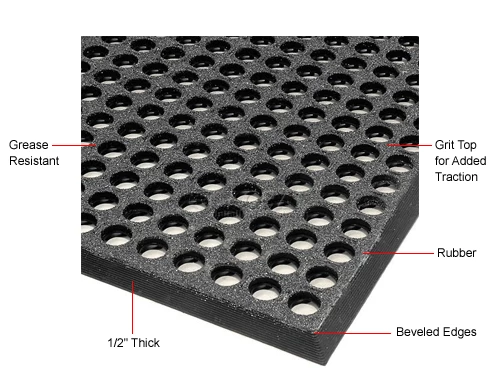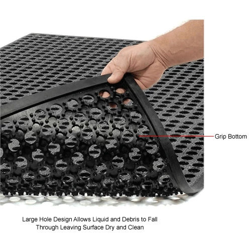 This 1/2″ thick rubber mat has 4 molded beveled edges to help prevent tripping and to allow easy movement of carts. Designed to withstand harsh chemicals while providing a slip resistant surface. Large-hole design allows liquid and debris to fall through leaving the surface dry and clean. This mat is also grease resistant. Grit top for added traction. 1 Year Limited Warranty.
