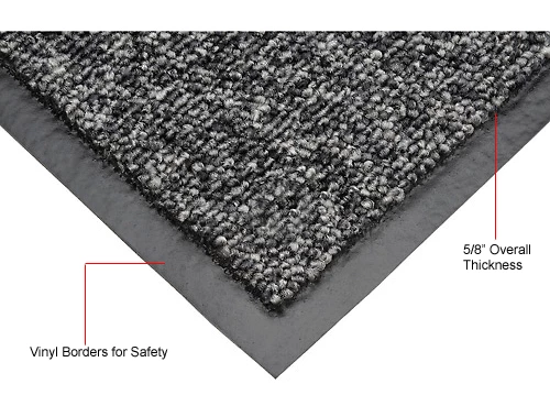 Protects electron equipment from static charges. Ideal for heavily trafficked indoor areas including computer workstations, cashier’s stations, offices, service counters, schools and libraries. 5/8″ thick carpet features conductive fiber top with vinyl backing that grips floors. Resists up to 109 ohms. Use with grounding cord (sold separately). Snap for ground connection not included.