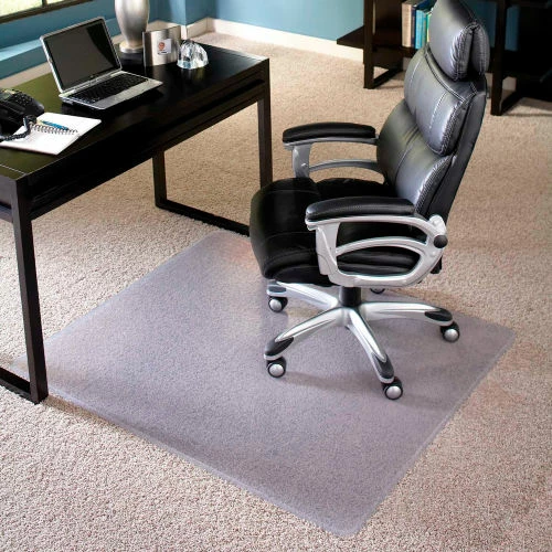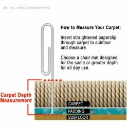 Overall dimensions of 46″ width and 60″ long rectangle; premium thickness 0.200 of an inch; beveled edge, designed for use on carpet (including padding) up to and beyond 1″ thick; The exclusive AnchorBar® cleat system replaces sharp pin cleats making it easier to handle the mat; Using a series of staggered, perpendicular bars, the cleat system “anchors” the mat as securely as traditional cleats yet is gentle on the carpet and fingers. All ES Robbins Office Chair Mats are proudly made in the USA.