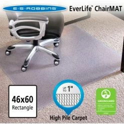 Overall dimensions of 46″ width and 60″ long rectangle; deluxe thickness 0.170 of an inch; beveled edge, designed for use on carpet (including padding) up to 1″ thick; The exclusive AnchorBar® cleat system replaces sharp pin cleats making it easier to handle the mat; Using a series of staggered, perpendicular bars, the cleat system “anchors” the mat as securely as traditional cleats yet is gentle on the carpet and fingers. All ES Robbins Office Chair Mats are proudly made in the USA.