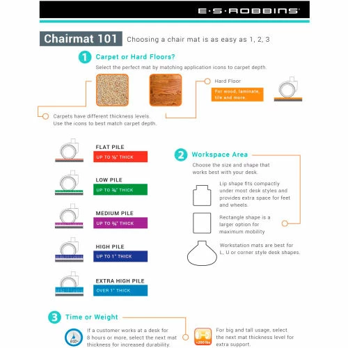 Instantly add style to your workspace with TrendSetter® chair mats. Protects carpets from scuffs, scrapes and chair caster wear. Provides a smooth rolling surface for less stress on legs and back. Use with Medium Pile Carpet up to 3/4″ thick (including padding depth). AnchorBar® cleat system that is gentle on hands and carpet, no sharp spikes. Durable vinyl construction. Designed for carpet use, do not use on hard floors. Transform your space with the beauty of a designer chair mat. The ES ROBBINS TrendSetter® collection includes a variety of laminated vinyl chair mats, crafted with a durable decorative top layer, that instantly add style to your workspace.