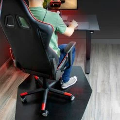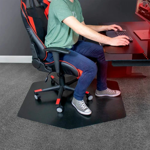 Cutting edge design with Next Level Innovation. Angular design provides maximum space utilization. Tapered form designed to fict compact setups and advanced gaming environments. Crafted with additional left-right glide area for movement during intense gaming. All-purpose cleat system for hard floors or carpet. Vinyl grip underside, no spikes Unique shape compliments premium gaming chairs and desks. Sleek design with light surface texture accent.