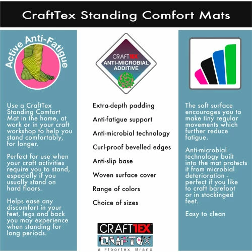 When your kitchen activity means standing for long periods of time, improve your personal comfort with a luxury kitchen anti-fatigue mat. The Floortex Standing Comfort Mat’s deep and supportive structure reduces fatigue when standing for long periods of time. Its soft cover is easy to clean. Use this comfort mat in studios, workshops and kitchens to improve your comfort. Suitable for carpet, rugs and hard floor.