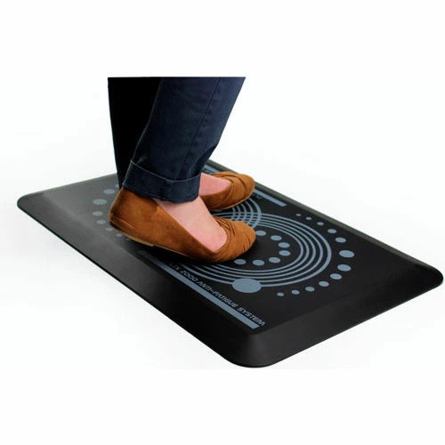 - Specially designed printed surface to encourage regular foot movement and changes in standing position that stimulate blood flow that help to reduce fatigue