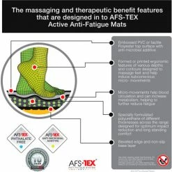AFS-TEX 2000X Active Anti-Fatigue mats are designed to provide the ultimate standing surfaces combining prolonged comfort and effective body support. The AFS-TEX 2000X incorporates a design to encourage the changes in standing positions. Regular movement stimulates blood flow, increase the body’s metabolism and helps with further fatigue relief. Effective 24/7 for the life of the product. Non-toxic and phthalate free. Ideal for office or home use.