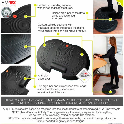 AFS-TEX 4000X Active Anti-Fatigue mats are designed to provide the ultimate standing surfaces combining prolonged comfort and effective body support. The AFS-TEX 4000X incorporates a design to encourage the changes in standing positions. Regular movement stimulates blood flow, increase the body’s metabolism and helps with further fatigue relief. Effective 24/7 for the life of the product. Non-toxic and phthalate free. Ideal for office or home use.
