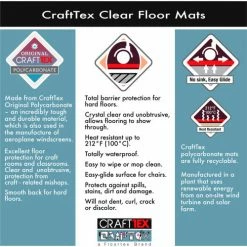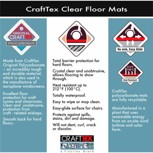 CraftTex clear floor mats are designed to offer a large area of barrier protection for hard floor such as; hardwood, tiles, ceramic and laminate. This mat protects hard floor from damage caused by dropped craft equipment, spilled paint, glitter and glue. Easy to wipe clean this protective mat won’t discolor, curl, bend or crack under normal use. Strong and long-lasting, the mat lies flat immediately and provides a waterproof barrier. Providing peace of mind that mess and spillages will be contained. This Polycarbonate mat is 100% recyclable, and is free from PVC and toxins.