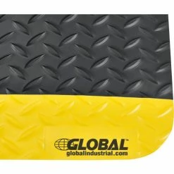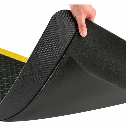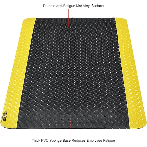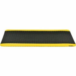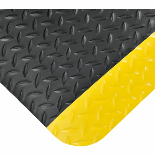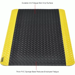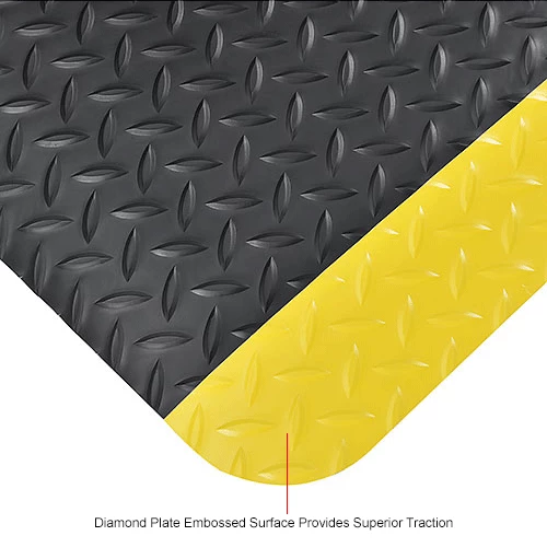 Anti-Fatigue mat made of chemical resistant vinyl, durable diamond tread plate surface bonded to a buoyant foam base. Beveled edges provide safety with Safety Colored Borders for maximum safety awareness.