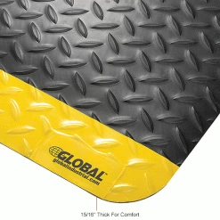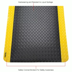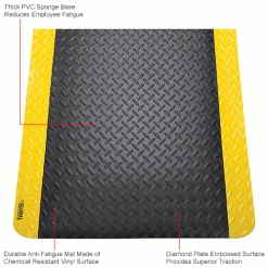 Anti-Fatigue mat made of chemical resistant vinyl, durable diamond tread plate surface bonded to a buoyant foam base. Beveled edges provide safety with Safety Colored Borders for maximum safety awareness.