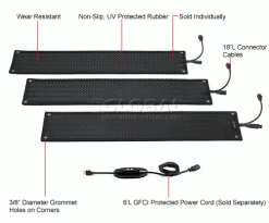 Outdoor stair mats are designed to endure harsh wear in winter seasons. Built with non-slip, UV protected rubber making it ideal for outdoor use. Stair mats include 3/8″ diameter grommet holes in every corner to secure mat to the surface. The mats are made of an electrically operated heating element sandwiched between two protective surfaces of non-slip rubber, making the mats as durable as automobile tires and wear resistant. Plugs into any standard outlet using a GFCI protected, 6’L power cord (sold separately). Each stair mat is 11″D x 1/4″ thick. Each stair mat is designed with watertight 18″L connector cables enabling it to connect to additional stair mats. Can connect up to 12 amps on a single outlet. Mats maintain an average temperature of 40 degrees above the ambient temperature. Turn the mat on before the snow begins to fall. The mats will melt snow at an average rate of approx. 2″ per hour. 2 Year Limited Warranty.