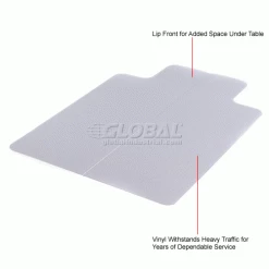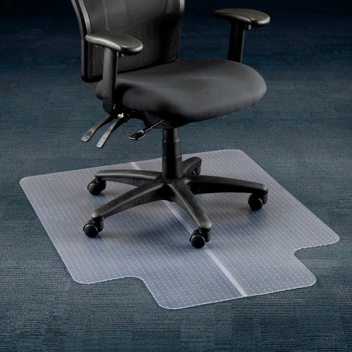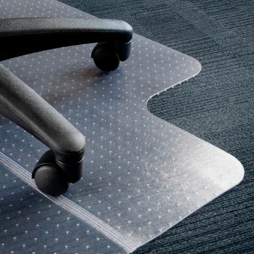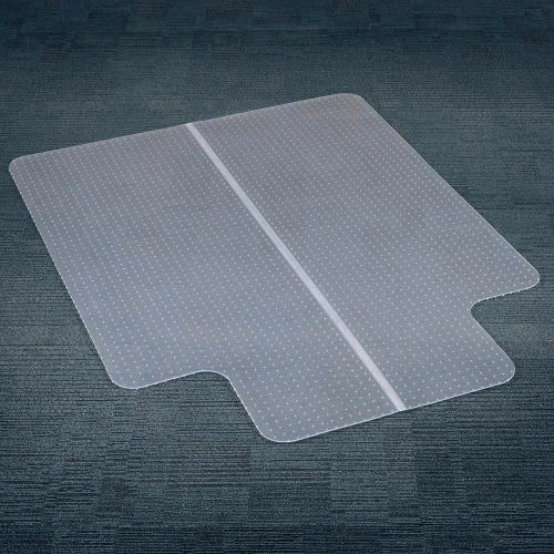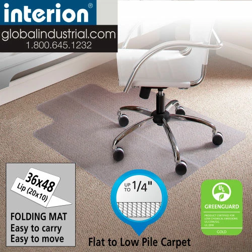 This versatile chair mat immediately unfolds for instant use right out of the box. The ability to fold the mat, reduce its size and easily move it from one are to the next is advantageous for workspaces that change or move. This sturdy, vinyl mat will help prolong the life of valuable flooring by protecting against chair caster wear and tear. Any chair user will be able to maneuver their chair easily and effortlessly, as this mat withstands heavy traffic and features an anti-skid textured top. Mat underside has anchor points to keep mat firmly positioned on carpeted surfaces. This chair mat is ideal for low pile carpet up to 1/4″ thick, including padding.