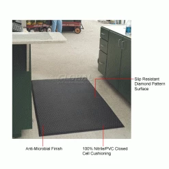 Anti-microbial, anti fatigue mat provides outstanding ergonomic support while guarding against odors and degradation. Anti fatigue safety mat is made of 100% Nitrile/PVC closed cell cushioning. Slip resistant diamond pattern surface is more than twice as durable as traditional PVC cushion mats. 5/8″ thick mat features an anti-microbial finish for lifetime protection against bacteria and odor causing germs. Borders are tapered for a safe transition from floor to mat. NFSI certified.