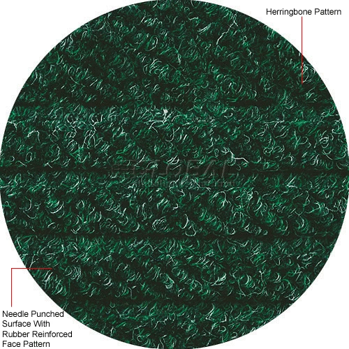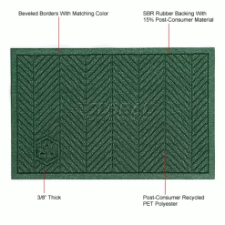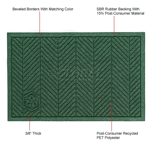 Carpet top is made from 100% post-consumer recycled pet polyester reclaimed from plastic bottles. Entrance mats feature needle punched surface with rubber reinforced face pattern. Carpet top fabric has a herringbone pattern for an attractive appearance. Backing is made with SBR rubber with 15% post-consumer recycled tires with a smooth back. These 3/8″ thick mats with rubber reinforced bi-level cleaning surface effectively stops dirt and moisture at the door. Beveled border with matching color for safety. Available in 8 colors. Passes Federal Flammability standard DOC FF 1-70. ANSI ESD s7.1 protection of electrostatic discharge. US Green Building Council member, NFSI certified.