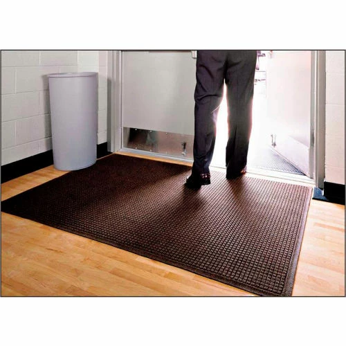 WaterHog Fashion Entrance Mats are made of 100% super-absorbent polypropylene for long lasting durability. The rubber reinforced face nubs and waffle design provide bi-level, crush-proof scraping action. Raised water dam border traps dirt and water to help keep debris off floors and carpets. The border also features the same 100% polypropylene fiber system as the mat surface. Good for indoor and outdoor use. The SBR rubber backing contains 20% recycled material. Certified slip-resistant by the National Floor Safety Institute. Dark Brown 4′ x 12′.