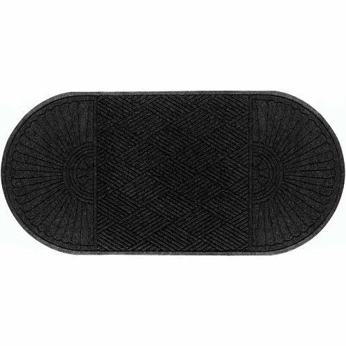 High performance, safety and attractive appearance. Waterhogâ„¢ mats are a 24 oz. polypropylene reinforced and backed with rubber. Construction includes a water dam feature that collects and holds water and bi-level texture to remove maximum dirt from shoes. Designed for indoors or out with crush resistant pile for extended life and superior anti-static properties. Cleated rubber back prevents slipping. Stylish patterning with fashion borders. Solution dyed to resist fading. Vacuum or hose clean. This style features two oval ends. Measures 3/8″ thick.