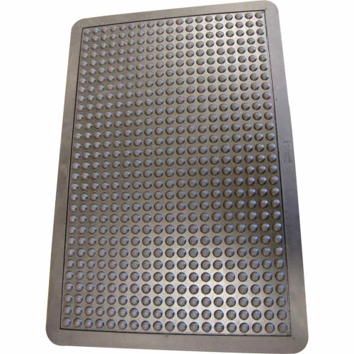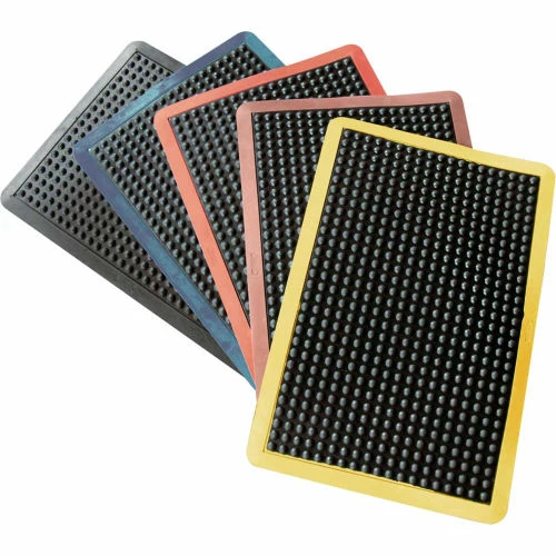 Bubble-Top Anti Fatigue Floor Mat, 5/8-inch x 2ft x 3ft Rubber Floor Mat, BlackBubble-Top rubber floor mat is a superior padded mat available in 2-feet x 3-feet size. This 5/8-inch thick anti fatigue floor mat is designed for comfort and worker efficiency. They provide a soft rubber surface that contains bubble-like protrusions for extra comfort. They are made with natural and reclaimed rubber materials, making for an eco-friendly addition to your floor. If you’re looking for a product that is sure to outlast all competitors, the Bubble-Top is an ideal anti fatigue floor mat. This ultra durable product is designed for applications that require a comfortable and resilient surface. Factories, assembly lines, and commercial kitchens choose rubber over sponge or foam floors, since they are not flimsy and are tear-resistant. In addition to its superior anti-fatigue qualities, the product is designed with a Bubble-Top surface that, combined with the high coefficient of friction found in natural rubber, offers extra traction for a safe non-slip rubber. This product fits perfectly in applications where moisture exists, making them useful as mats for the kitchen or bathroom. Not only is the Bubble-Top a safe and comfortable product, but these eco friendly floor mats are made with natural and reclaimed rubber materials such as used tires. These mats present a durable flooring option with beveled perimeters to help visually define them. While air is trapped in the subsurface of the mat, you are left with a flooring option that offers ample support and relief. This rubber floormat is a cost-efficient product that is made to last. Keeping you safe with its non-slip rubber material, the Bubble-Top is the perfect choice for uses around any form of moisture.