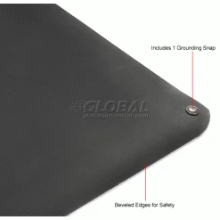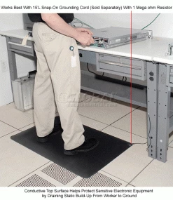 from workers to ground. Nitrile rubber composite sponge base reduces workers fatigue. 1/8″ smooth vinyl surface comes with 1 grounding snap per mat. 1/2″ thick Smooth surface offers 1 x 104 to 1 x 106 ohms resistance.