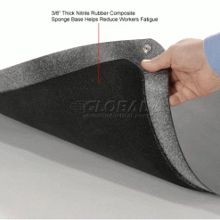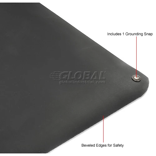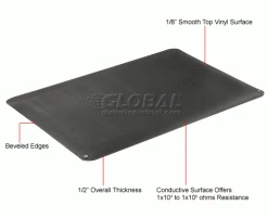 from workers to ground. Nitrile rubber composite sponge base reduces workers fatigue. 1/8″ smooth vinyl surface comes with 1 grounding snap per mat. 9/16″ thick Smooth surface offers 1 x 104 to 1 x 106 ohms resistance.